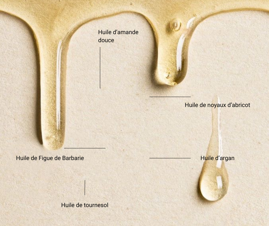 Sans parfum : Helianthus Annuus (Sunflower) Seed Oil, Prunus Amygdalus Dulcis (Sweet Almond) Oil, Hydrogenated Ethylhexyl Olivate, Prunus Armeniaca (Apricot) Kernel Oil, Argania Spinosa Kernel Oil, Opuntia Ficus-Indica Seed Oil, Laminaria Ochroleuca Extract, Tocopherol.